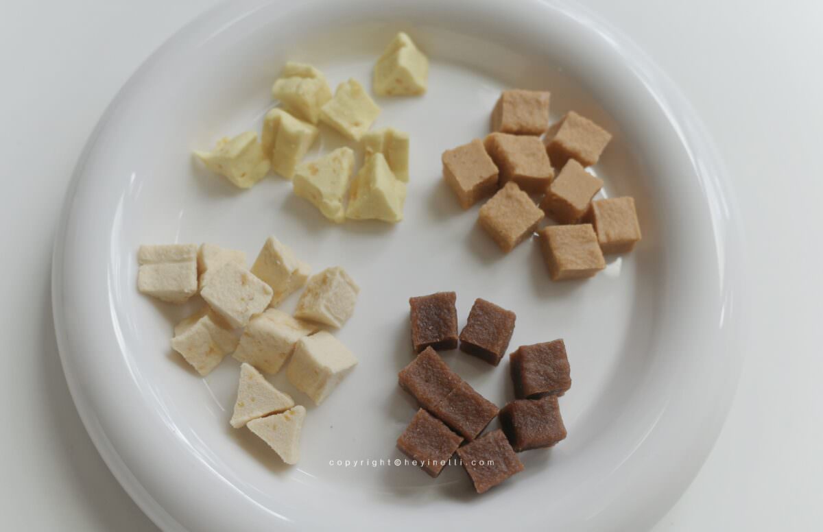 仔細看會發現陪陪肉肉機能狗點心裡面有深色的顆粒,這個是魚皮唷!陪陪地瓜起司丁的則是狗狗超愛的起司塊。要特別提醒大家「陪陪香濃起司丁、地瓜起司丁」這兩個口味含有起司,對起司或乳製品敏感的狗狗不建議食用喔!